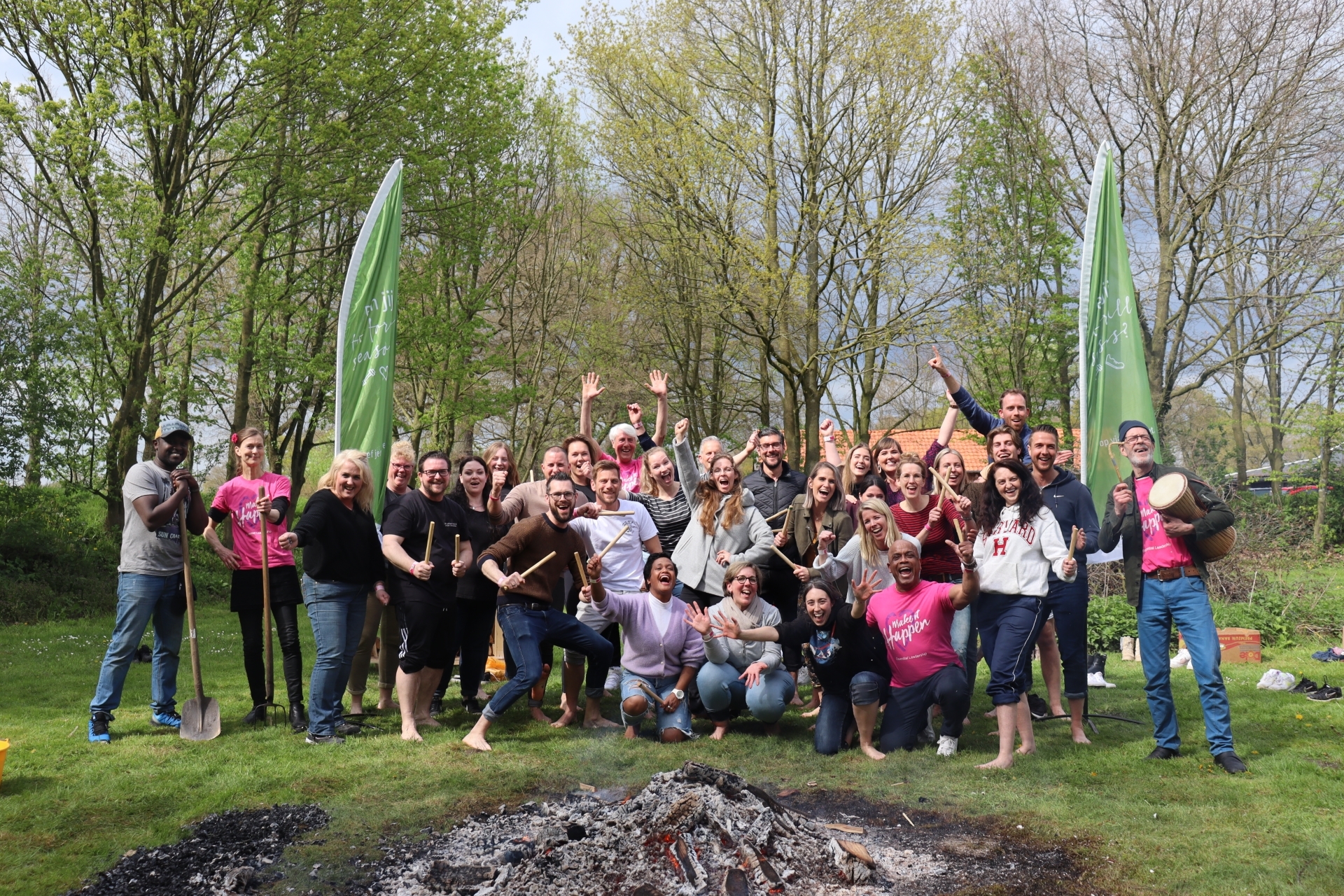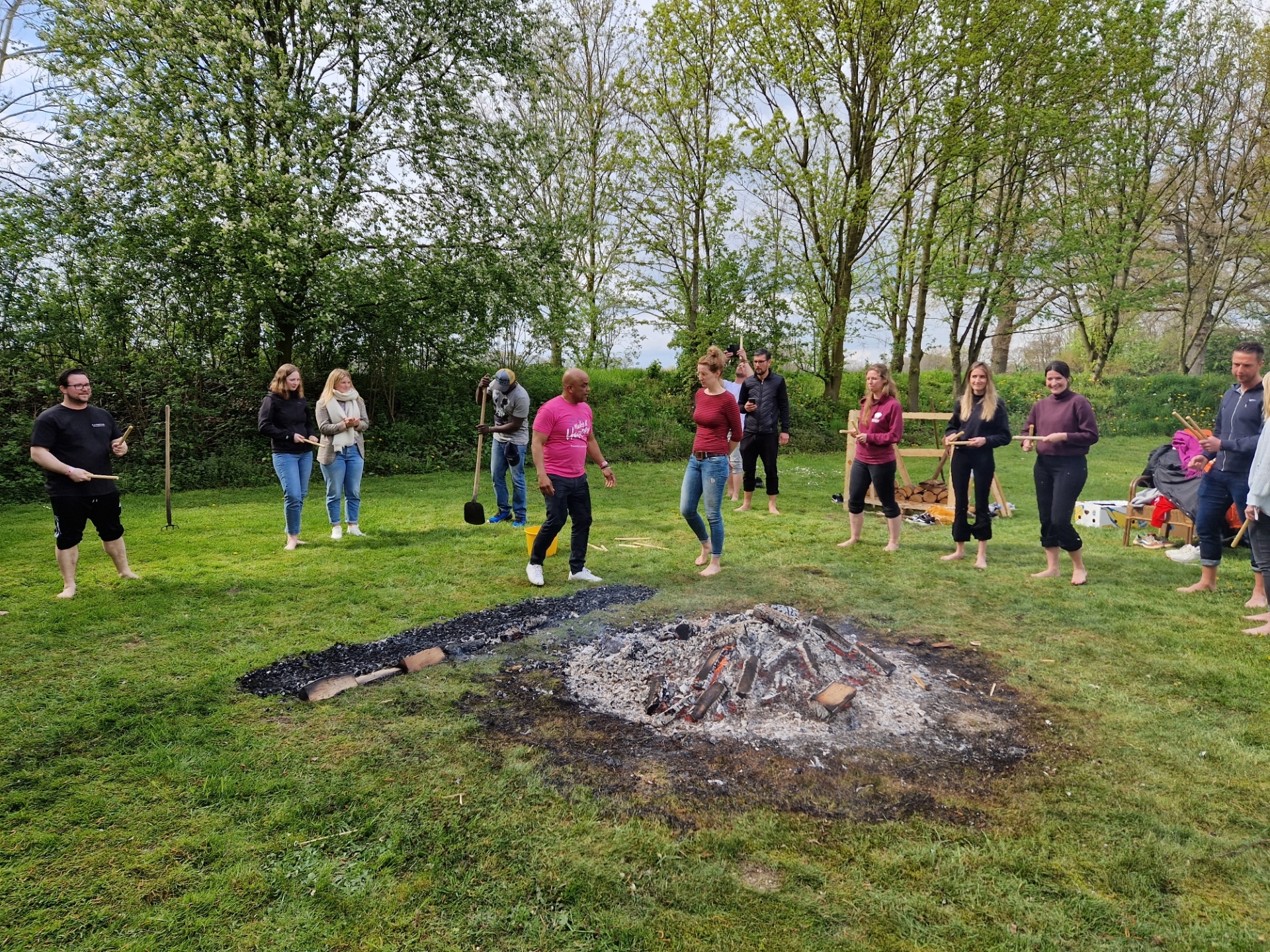 En dan was het moment daar voor de ultieme uitdaging: mentaal, emotioneel en fysiek in een piekstaat komen. Na een muzikaal optreden liepen ze allemaal met twee houten stokjes richting het kampvuur. Hier zou het gebeuren; vuurlopen! De aanstekelijke djembé-muziek zorgde voor een stimulerende sfeer, en alle collega's tikten enthousiast mee op de maat. Belemmerende gedachten en angst werden opzij gezet. Zestig voetjes trotseerden de hete kolen, en het daverende applaus weerklonk in Aalten. Wat een kippenvelmoment!